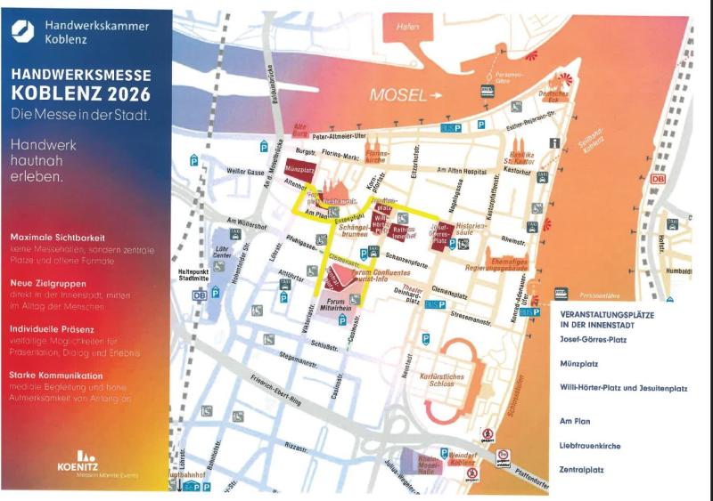 Handwerksmesse 2.0 ! Die erfahrene Messegesellschaft Koenitz GmbH führt in der Koblenzer Innenstadt vom 17. bis 19. April 2026 die Handwerksmesse 2.0 – „Die Messe in der Stadt“ durch. Wir unterstützen diese Idee und sind vom Konzept überzeugt, denn gerade da, wo sich die Menschen bewegen, auf den Wegen und Plätzen der Innenstadt, können erstklassige und zielführende Kontakte hergestellt werden. Hier haben Sie die hervorragende Gelegenheit, ihre Leistungsfähigkeit ohne Schwellenangst einem breiten Publikum zu präsentieren, denn wenn Sie an der „Messe in der Stadt“ teilnehmen, können Sie nicht nur neue Kunden gewinnen, sondern wahrscheinlich auch neue Mitarbeiter/Auszubildende für einen Arbeitsplatz in Ihrem Betrieb begeistern. Wenn Sie sich bis zum 15.01.2026 für eine Teilnahme entscheiden erhalten Sie „20%-Frühbucherrabatt“ auf die Spitzdachzelte und Freigeländeflächen. Für Rückfragen wenden Sie sich