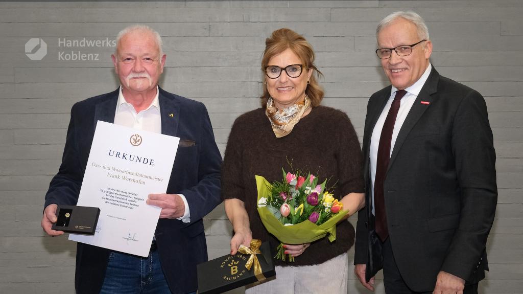 In Anerkennung seiner über 15-jährigen, verantwortungsvollen, erfolgreichen und ehrenamtlichen Tätigkeit für das Handwerk wurde Kreishandwerksmeister Frank Wershofen, Bad Neuenahr-Ahrweiler, feierlich mit der Goldenden Ehrennadel ausgezeichnet.